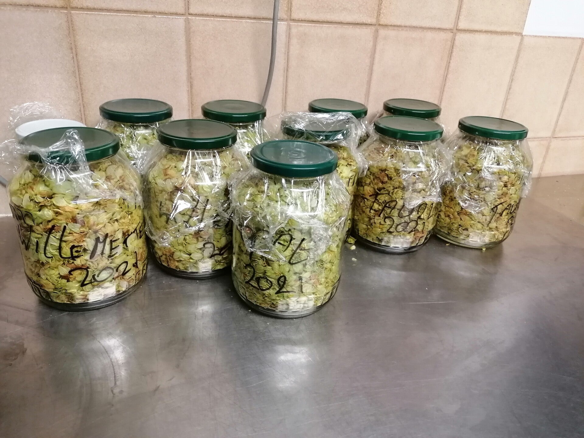 Links staat de opbrengst van 2021, deze potten zijn nu vacuüm. Straks ga ik brouwpaketjes maken van deze oogst. Ik verpak alles in zakjes die zo in de brouwketel kunnen. Daarna gaan de zakjes per biersoort bij elkaar in een zak en wordt alles weer vacuüm gezogen zoals rechts op de afbeelding is te zien.